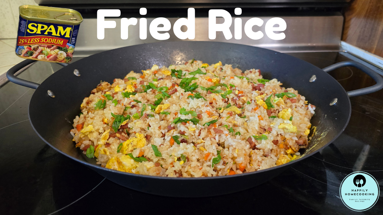 Spam fried rice is such a comfort food, and a great side dish for any hawaiian or asian meal. It’s the perfect way to use up leftover cooked white rice, as chilling the rice helps it dry out and not be too sticky or mushy. All you need is a large pan, and the ingredients below.